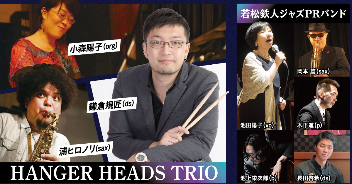 出演 | 1部出演 若松鉄人ジャズPRバンド 岡本管(sax)、木下進(p)、池上栄次郎(b)、長田啓希(ds)、池田陽子(vo) 2部出演 ハンガーヘッドトリオ 小森陽子(org)、浦ヒロノリ(sax)、鎌倉規匠(ds) |